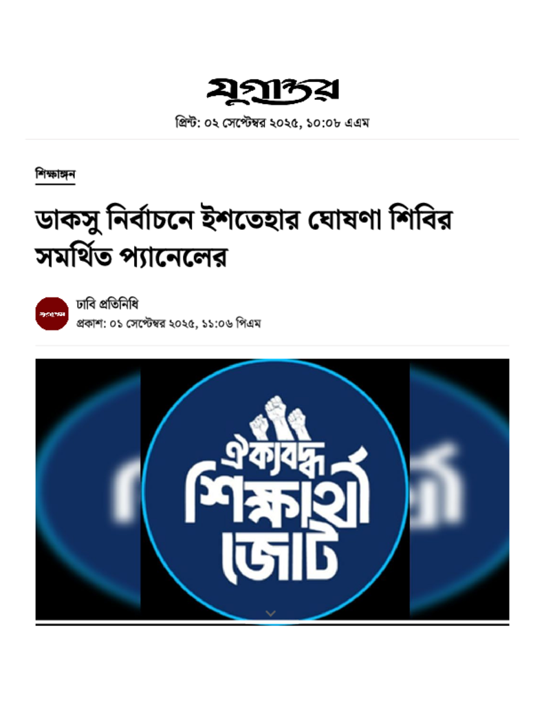 ডাকসু নির্বাচনে ইশতেহার ঘোষণা শিবির সমর্থিত প্যানেলের.pdf Published on 01 September 2025 Newspaper দৈনিক যুগান্তর Category Student Politics General Education Download