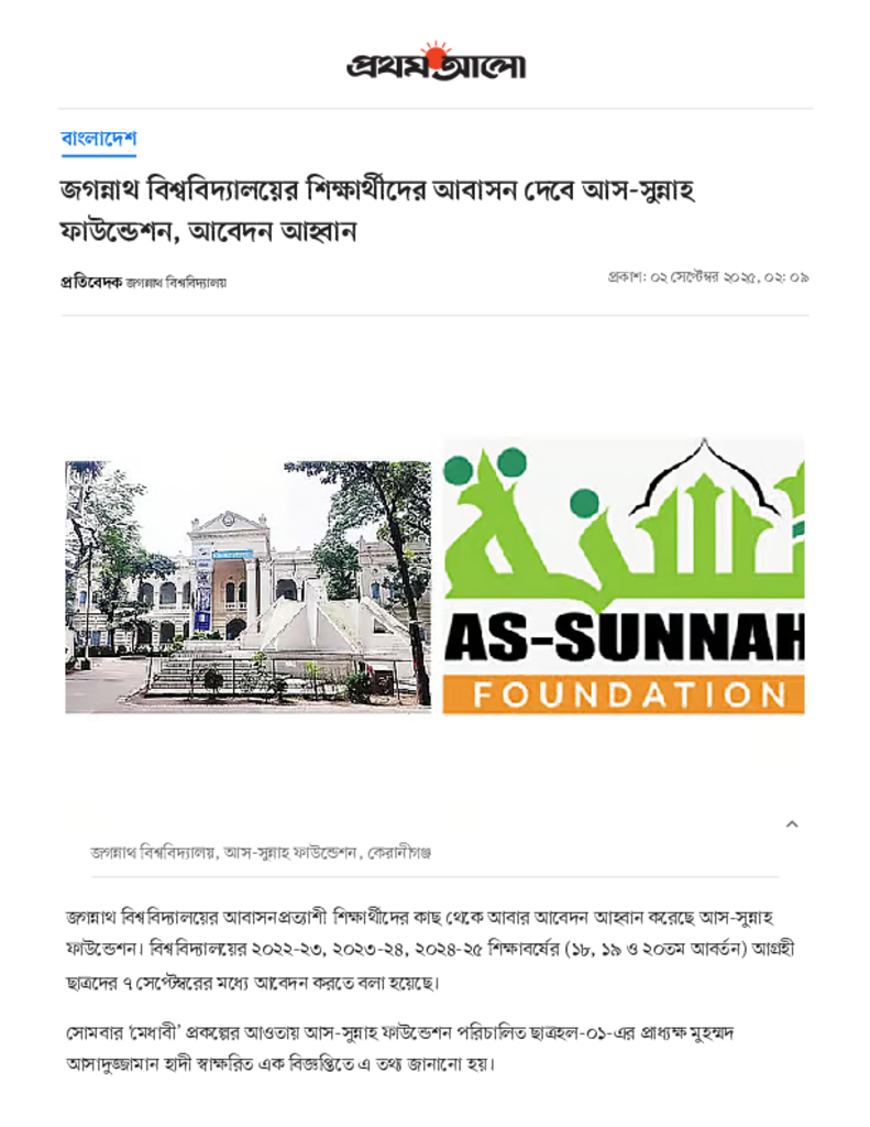 জগন্নাথ বিশ্ববিদ্যালয়ের শিক্ষার্থীদের আবাসন দেবে আস-সুন্নাহ ফাউন্ডেশন, আবেদন আহ্বান.pdf Published on 02 September 2025 Newspaper দৈনিক প্রথম আলো Category Others Download