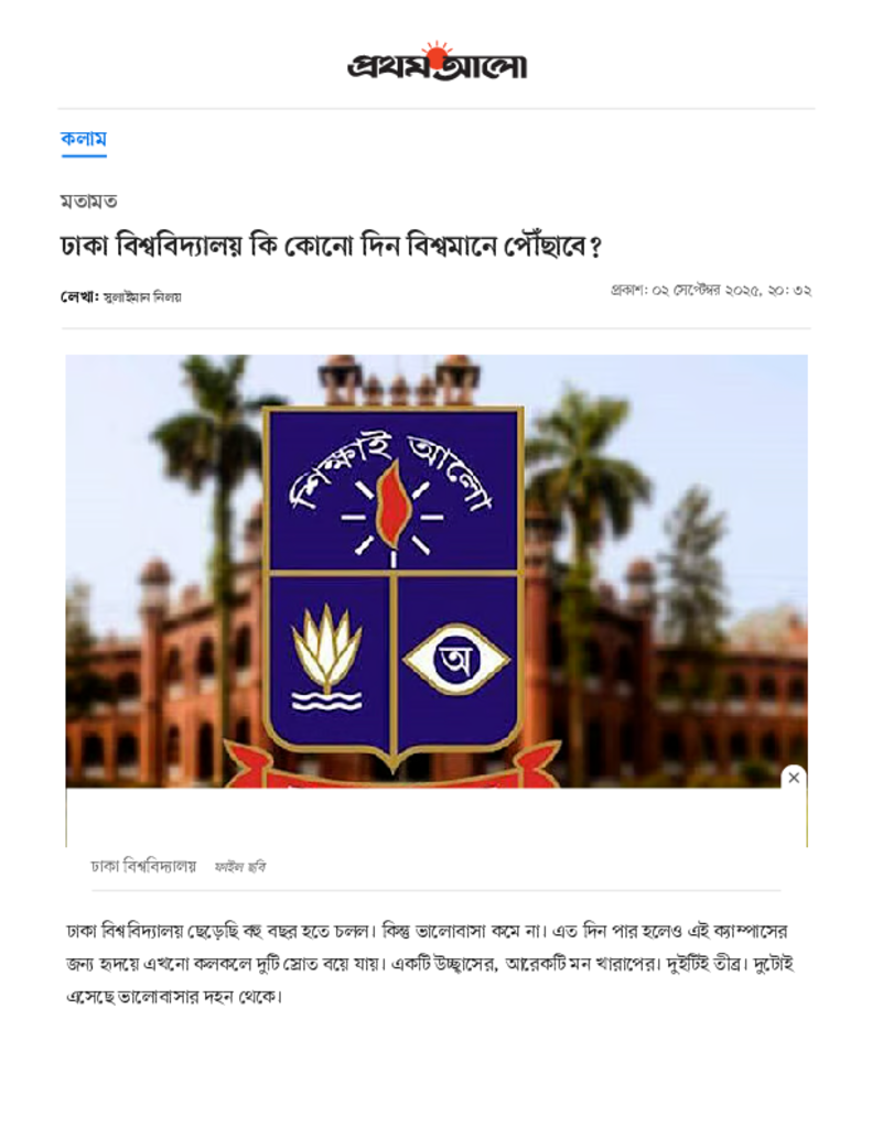 ঢাকা বিশ্ববিদ্যালয় কি কোনো দিন বিশ্বমানে পৌঁছাবে_.pdf Published on 02 September 2025 Newspaper দৈনিক প্রথম আলো Category Personal Opinion / Discussion / Commentary General Education Download