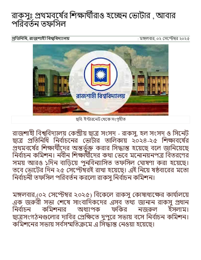 রাকসুঃ প্রথমবর্ষের শিক্ষার্থীরাও হচ্ছেন ভোটার , আবার পরিবর্তন তফসিল _ সংবাদ.pdf Published on 02 September 2025 Newspaper দৈনিক সংবাদ Category Personal Opinion / Discussion / Commentary Download