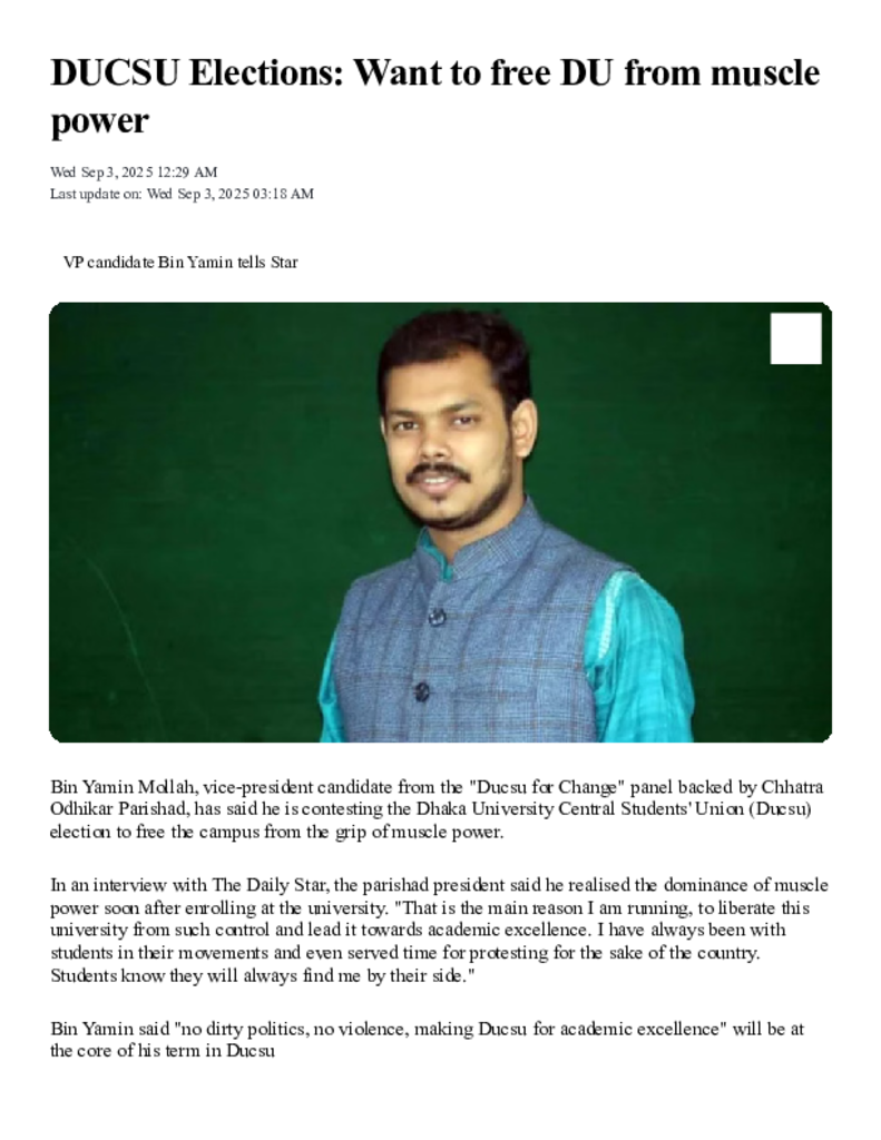 DUCSU Elections_ Want to free DU from muscle power _ The Daily Star.pdf Published on 03 September 2025 Newspaper The Daily Star Category Student Politics General Education Download