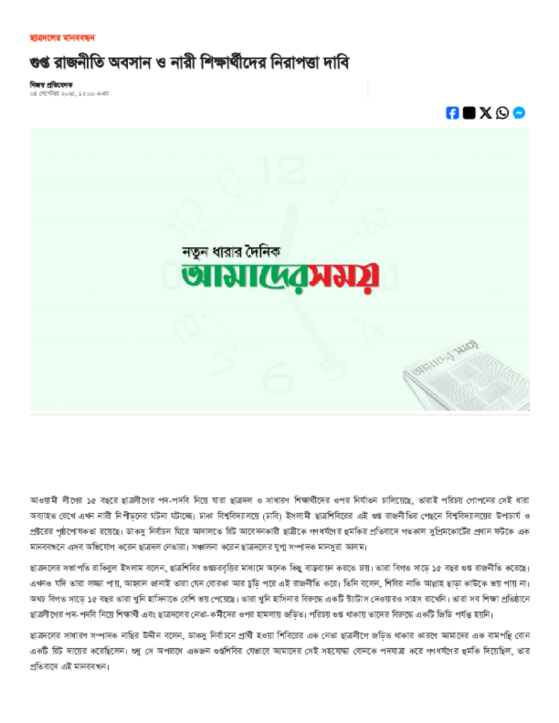 গুপ্ত রাজনীতি অবসান ও নারী শিক্ষার্থীদের নিরাপত্তা দাবি.pdf Published on 04 September 2025 Newspaper দৈনিক আমাদের সময় Category Personal Opinion / Discussion / Commentary Download