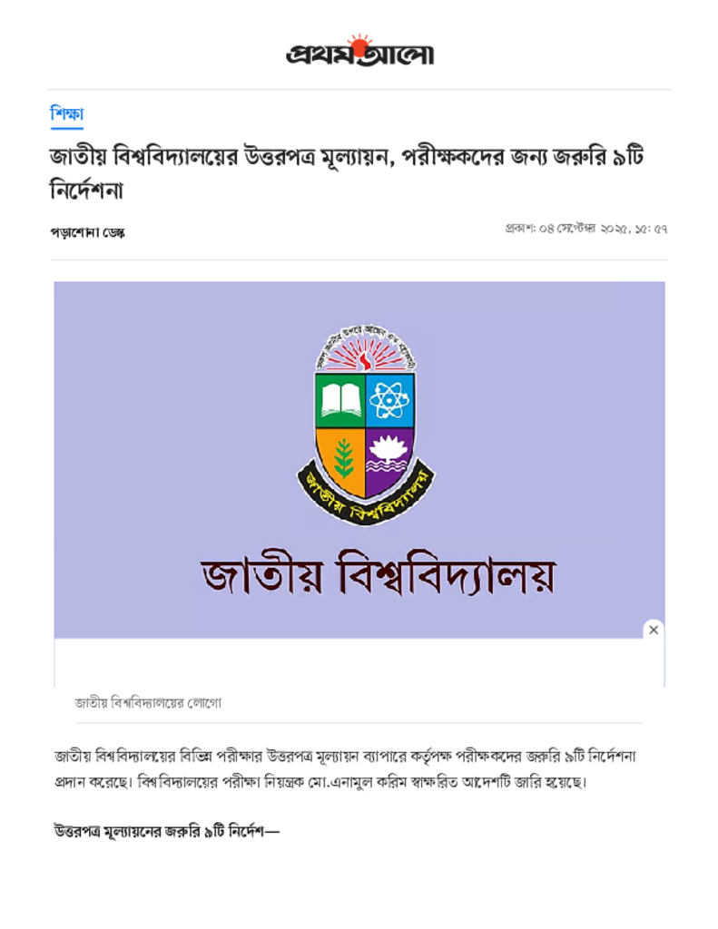 জাতীয় বিশ্ববিদ্যালয়ের উত্তরপত্র মূল্যায়ন, পরীক্ষকদের জন্য জরুরি ৯টি নির্দেশনা.pdf Published on 04 September 2025 Newspaper দৈনিক প্রথম আলো Category General Education General Education Download