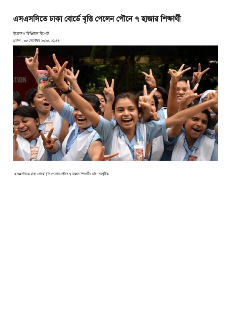 এসএসসিতে ঢাকা বোর্ডে বৃত্তি পেলেন পৌনে ৭ হাজার শিক্ষার্থী.pdf Published on 05 September 2025 Newspaper দৈনিক ইত্তেফাক Category Educational Ministry / Departments Education Ministry / Division / Directorate Public Examination SSC Download