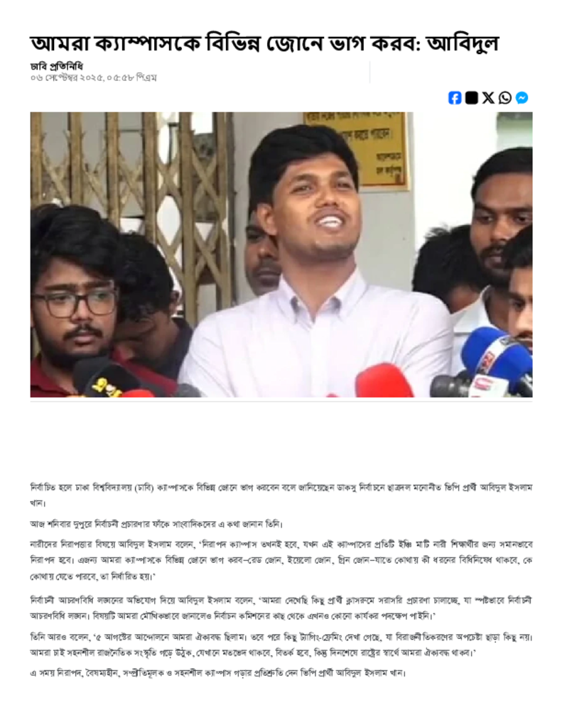 আমরা ক্যাম্পাসকে বিভিন্ন জোনে ভাগ করব_ আবিদুল.pdf Published on 06 September 2025 Newspaper দৈনিক আমাদের সময় Category Personal Opinion / Discussion / Commentary General Education Download
