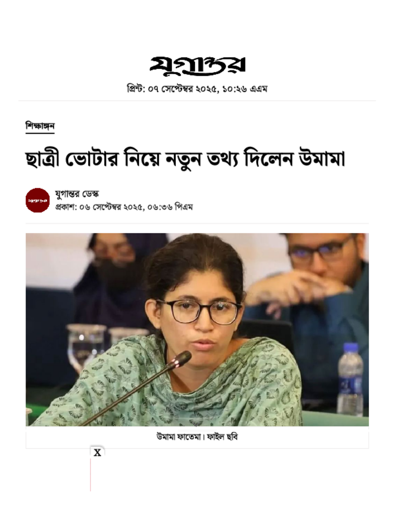 ছাত্রী ভোটার নিয়ে নতুন তথ্য দিলেন উমামা.pdf Published on 06 September 2025 Newspaper দৈনিক যুগান্তর Category Student Politics General Education Download
