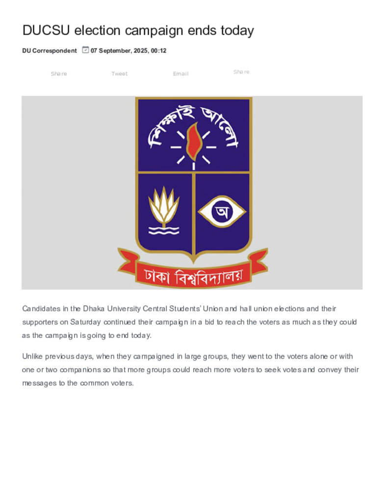 New Age _ DUCSU election campaign ends today.pdf Published on 07 September 2025 Newspaper New Age Category Student Politics General Education Download