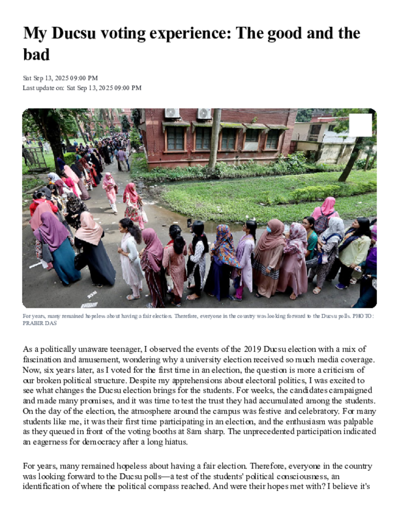 My Ducsu voting experience_ The good and the bad _ The Daily Star.pdf Published on 13 September 2025 Newspaper The Daily Star Category Personal Opinion / Discussion / Commentary Download