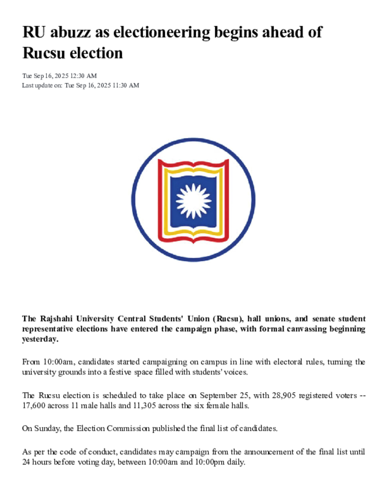 RUCSU Election 2025 _ RU abuzz as electioneering begins ahead of Rucsu election.pdf Published on 16 September 2025 Newspaper The Daily Star Category Student Politics General Education Download