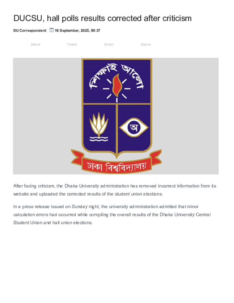 New Age _ DUCSU, hall polls results corrected after criticism.pdf Published on 16 September 2025 Newspaper New Age Category Student Politics Download