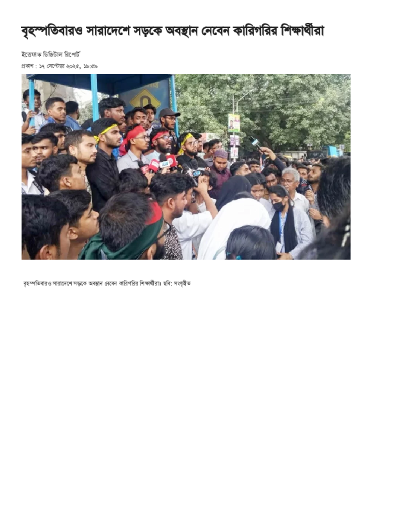 বৃহস্পতিবারও সারাদেশে সড়কে অবস্থান নেবেন কারিগরির শিক্ষার্থীরা.pdf Published on 17 September 2025 Newspaper দৈনিক ইত্তেফাক Category Technical and Vocational Education Download