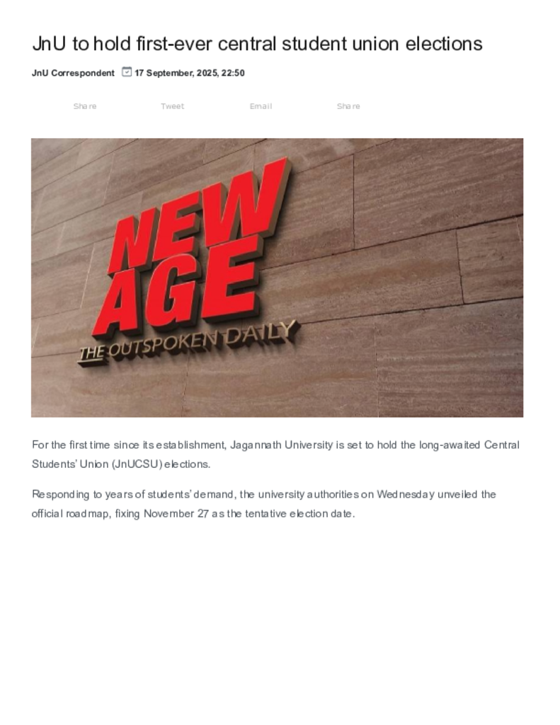 New Age _ JnU to hold first-ever central student union elections.pdf Published on 17 September 2025 Newspaper New Age Category Student Politics General Education Download