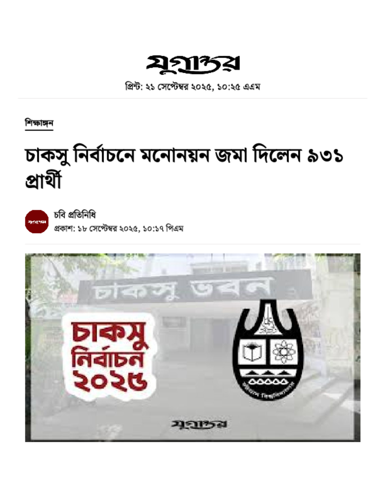 চাকসু নির্বাচনে মনোনয়ন জমা দিলেন ৯৩১ প্রার্থী.pdf Published on 18 September 2025 Newspaper দৈনিক যুগান্তর Category Student Politics Download