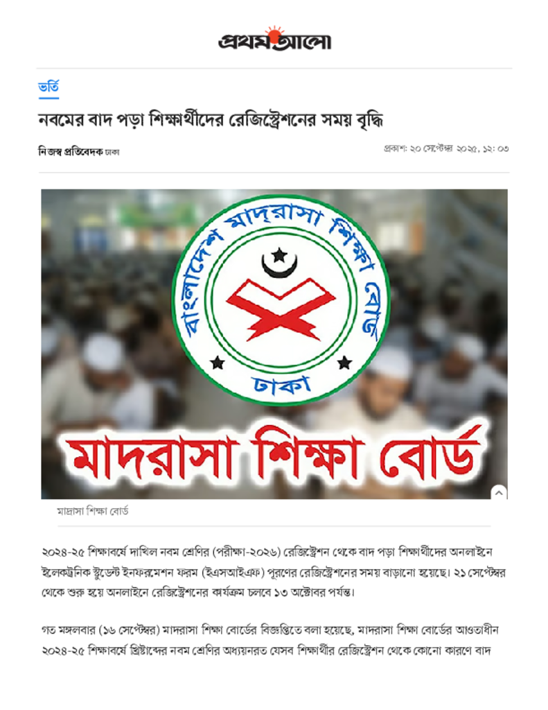 নবমের বাদ পড়া শিক্ষার্থীদের রেজিস্ট্রেশনের সময় বৃদ্ধি _ প্রথম আলো.pdf Published on 20 September 2025 Newspaper দৈনিক প্রথম আলো Category Educational Ministry / Departments Download