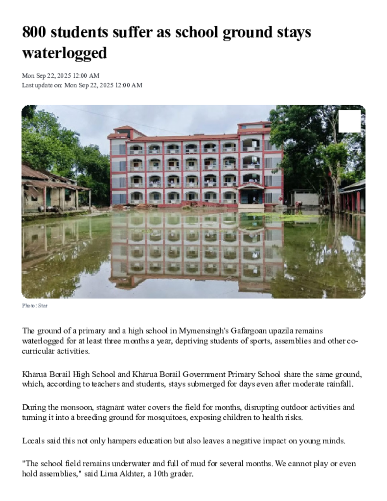 800 students suffer as school ground stays waterlogged _ The Daily Star.pdf Published on 22 September 2025 Newspaper The Daily Star Category Personal Opinion / Discussion / Commentary Download