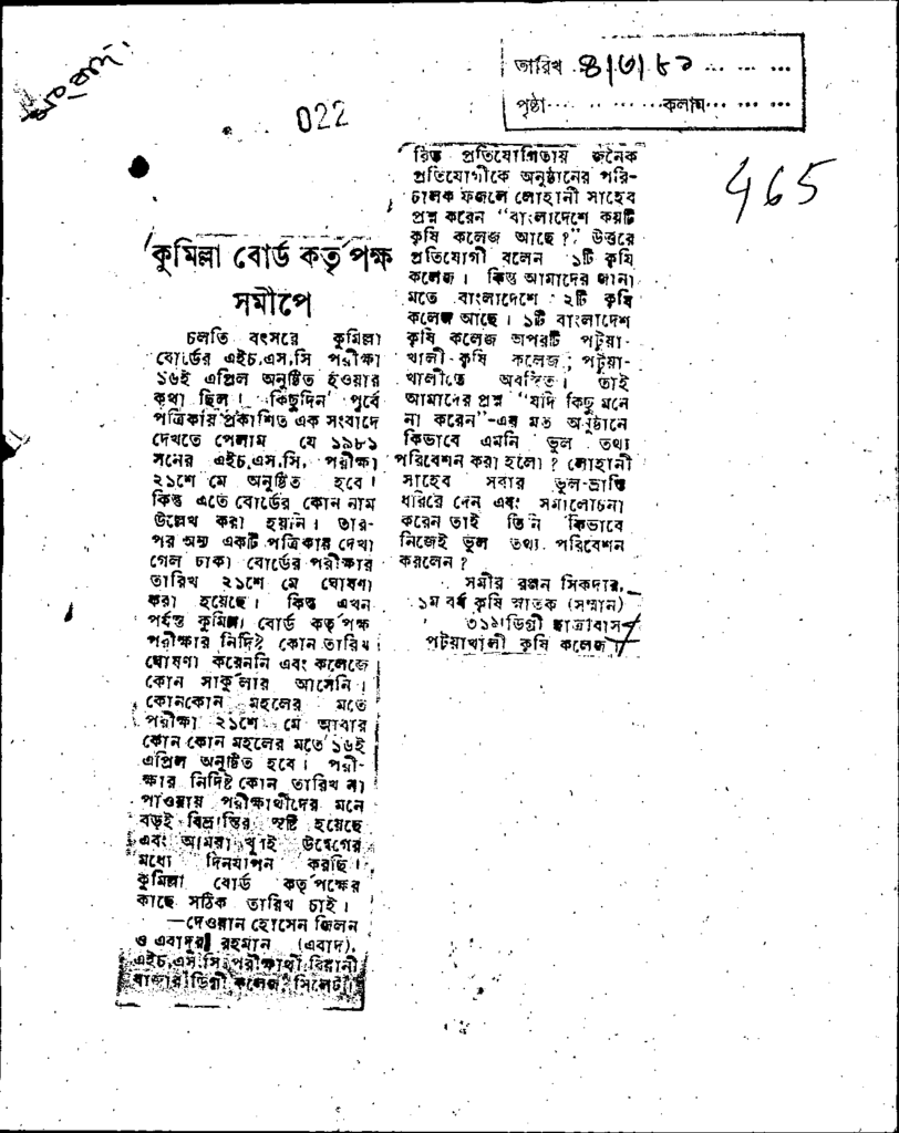 কুমিল্লা বোর্ড কর্তৃপক্ষ সমীপে Published on Newspaper দৈনিক সংবাদ Category General Education Download
