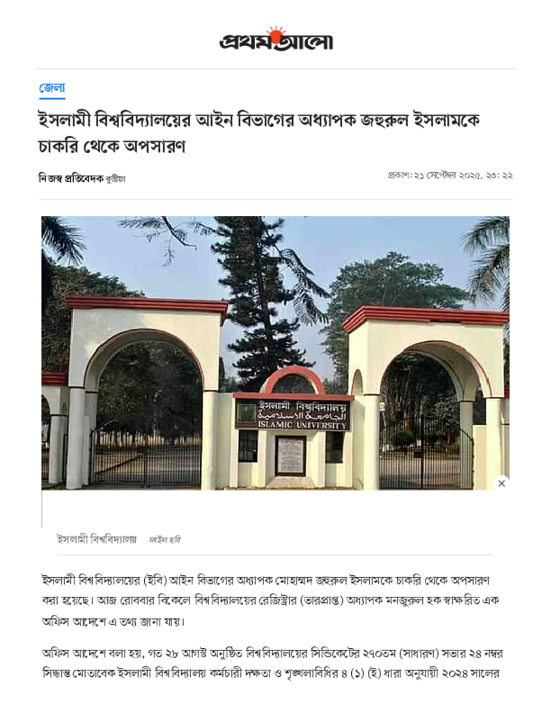 ইসলামী বিশ্ববিদ্যালয়ের আইন বিভাগের অধ্যাপক জহুরুল ইসলামকে চাকরি থেকে অপসারণ.pdf Published on 21 September 2025 Newspaper দৈনিক প্রথম আলো Category Educational Ministry / Departments General Education Download