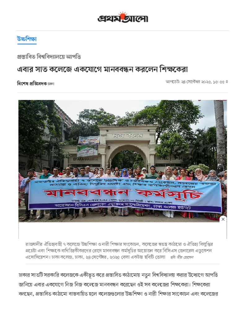 এবার সাত কলেজে একযোগে মানববন্ধন করলেন শিক্ষকেরা.pdf Published on 24 September 2025 Newspaper দৈনিক প্রথম আলো Category Personal Opinion / Discussion / Commentary General Education Download