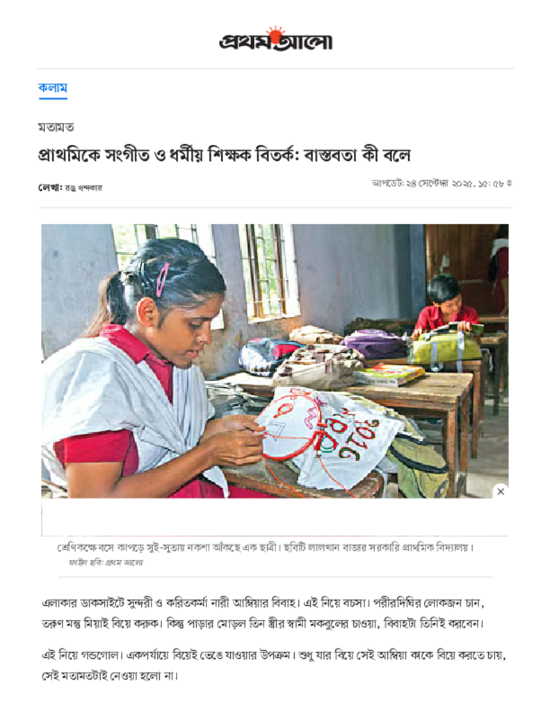 প্রাথমিকে সংগীত ও ধর্মীয় শিক্ষক বিতর্ক_ বাস্তবতা কী বলে.pdf Published on 24 September 2025 Newspaper দৈনিক প্রথম আলো Category Personal Opinion / Discussion / Commentary Download