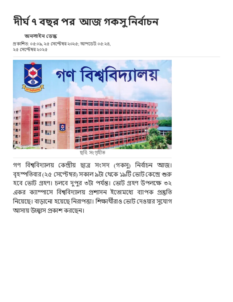 দীর্ঘ ৭ বছর পর আজ গকসু নির্বাচন.pdf Published on 25 September 2025 Newspaper দৈনিক জনকণ্ঠ Category Student Politics General Education Download