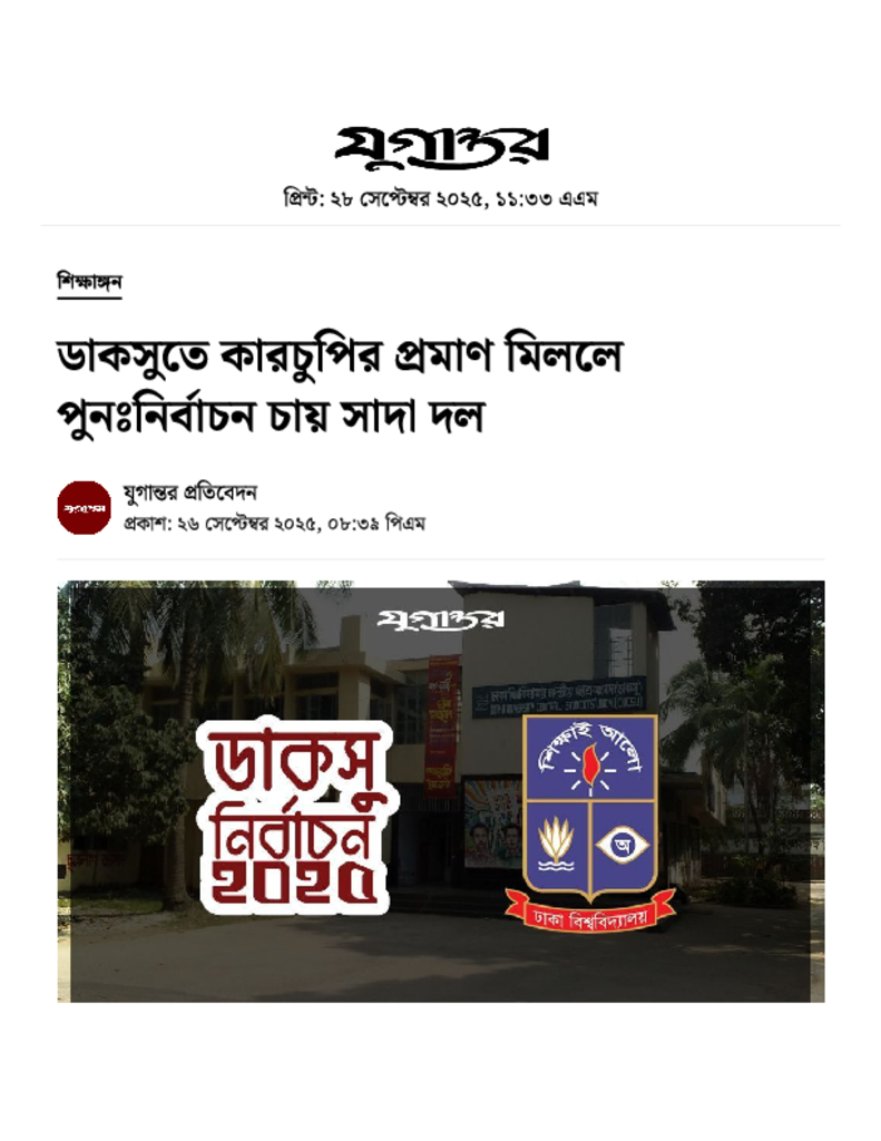 ডাকসুতে কারচুপির প্রমাণ মিললে পুনঃনির্বাচন চায় সাদা দল.pdf Published on 26 September 2025 Newspaper দৈনিক যুগান্তর Category Student Politics General Education Download
