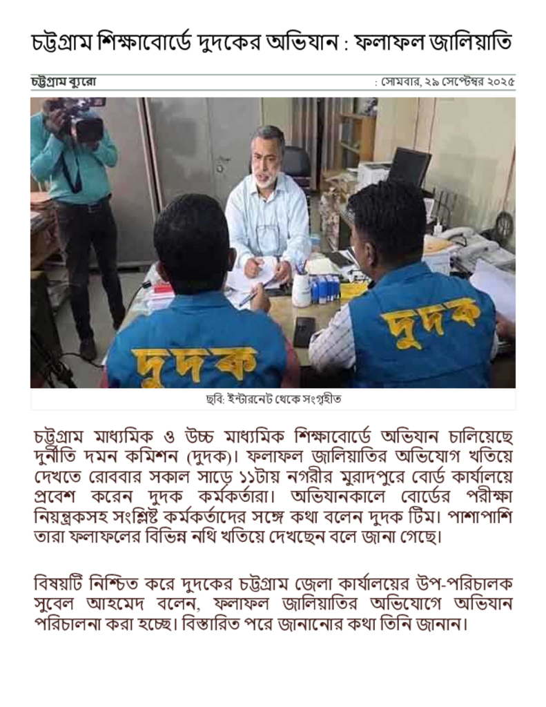 চট্টগ্রাম শিক্ষাবোর্ডে দুদকের অভিযান _ ফলাফল জালিয়াতি _ সংবাদ অনলাইন.pdf Published on 29 September 2025 Newspaper দৈনিক সংবাদ Category Educational Ministry / Departments Education Ministry / Division / Directorate Download