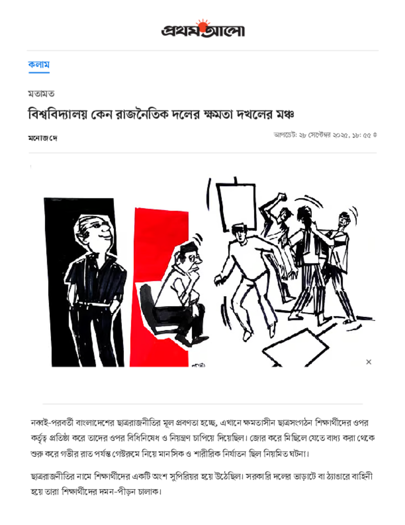 বিশ্ববিদ্যালয় কেন রাজনৈতিক দলের ক্ষমতা দখলের মঞ্চ.pdf Published on 28 September 2025 Newspaper দৈনিক প্রথম আলো Category Personal Opinion / Discussion / Commentary Download