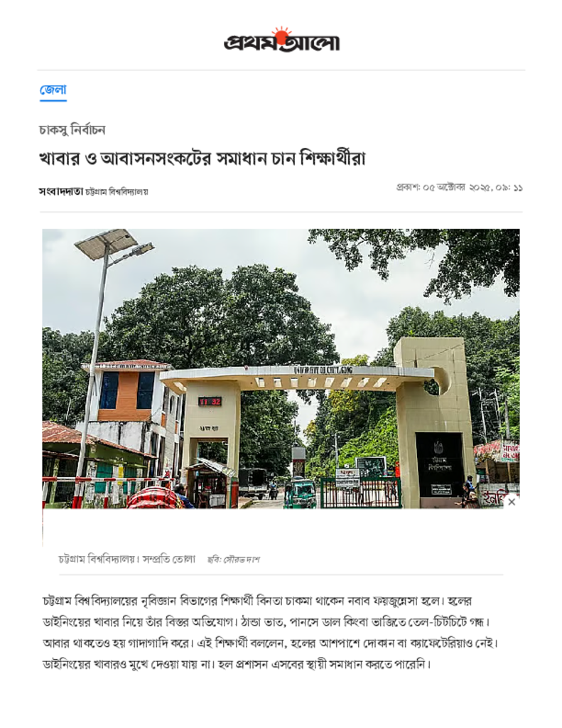 চট্টগ্রাম বিশ্ববিদ্যালয়ে আবাসনসংকট, হলের খাবারের মান নিয়ে ক্ষুব্ধ শিক্ষার্থীরা.pdf Published on 05 October 2025 Newspaper দৈনিক প্রথম আলো Category Admission / Seat Problem General Education Download