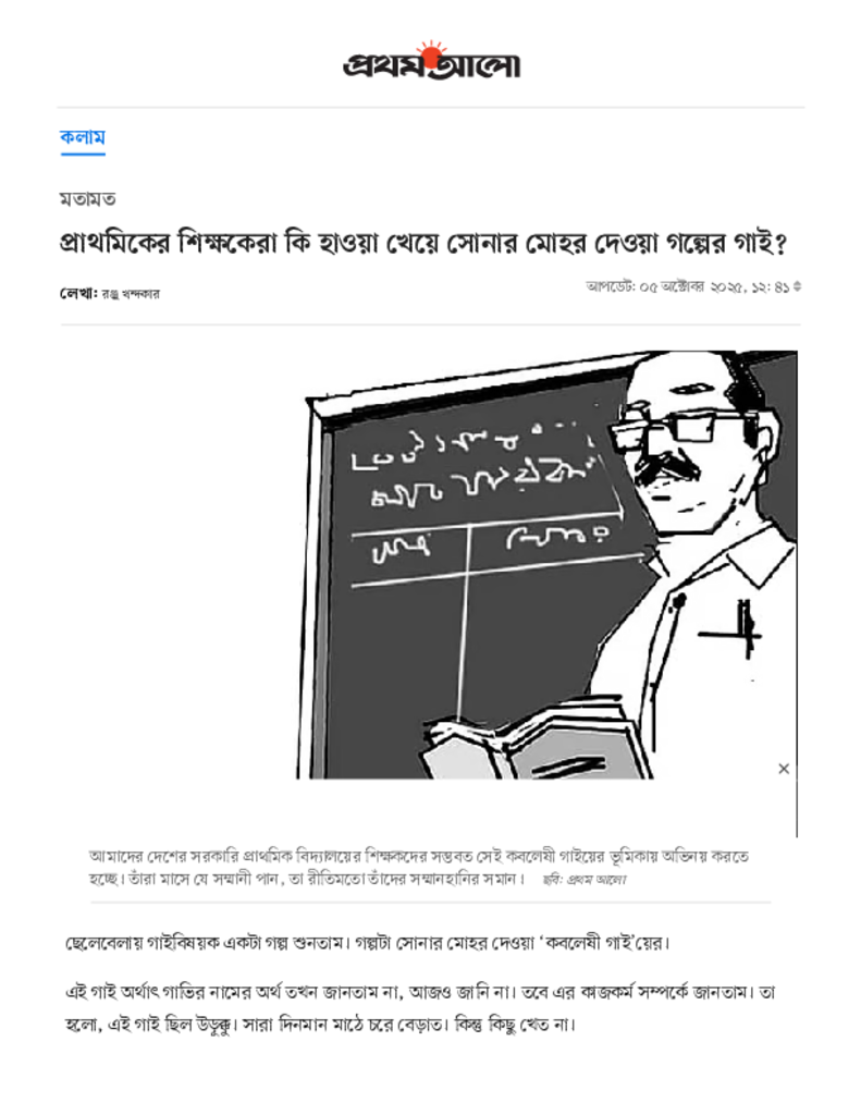 প্রাথমিকের শিক্ষকেরা কি হাওয়া খেয়ে সোনার মোহর দেওয়া গল্পের গাই_.pdf Published on 05 October 2025 Newspaper দৈনিক প্রথম আলো Category Personal Opinion / Discussion / Commentary General Education Download