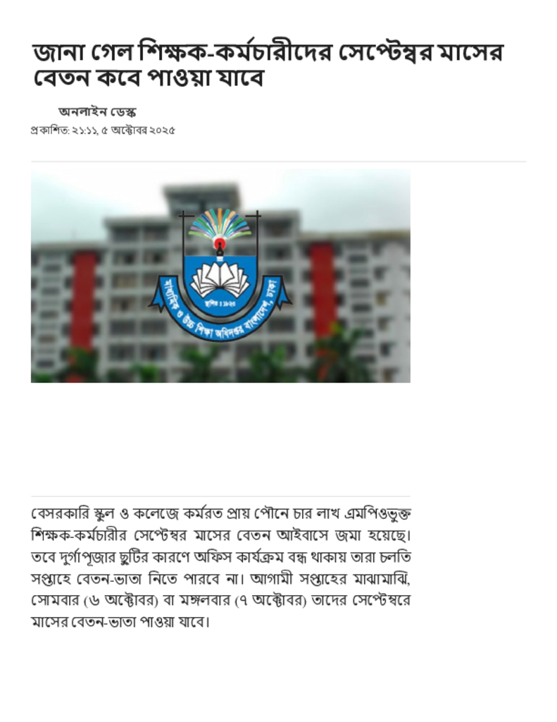 জানা গেল শিক্ষক-কর্মচারীদের সেপ্টেম্বর মাসের বেতন কবে পাওয়া যাবে.pdf Published on 05 October 2025 Newspaper দৈনিক জনকণ্ঠ Category Educational Ministry / Departments Download