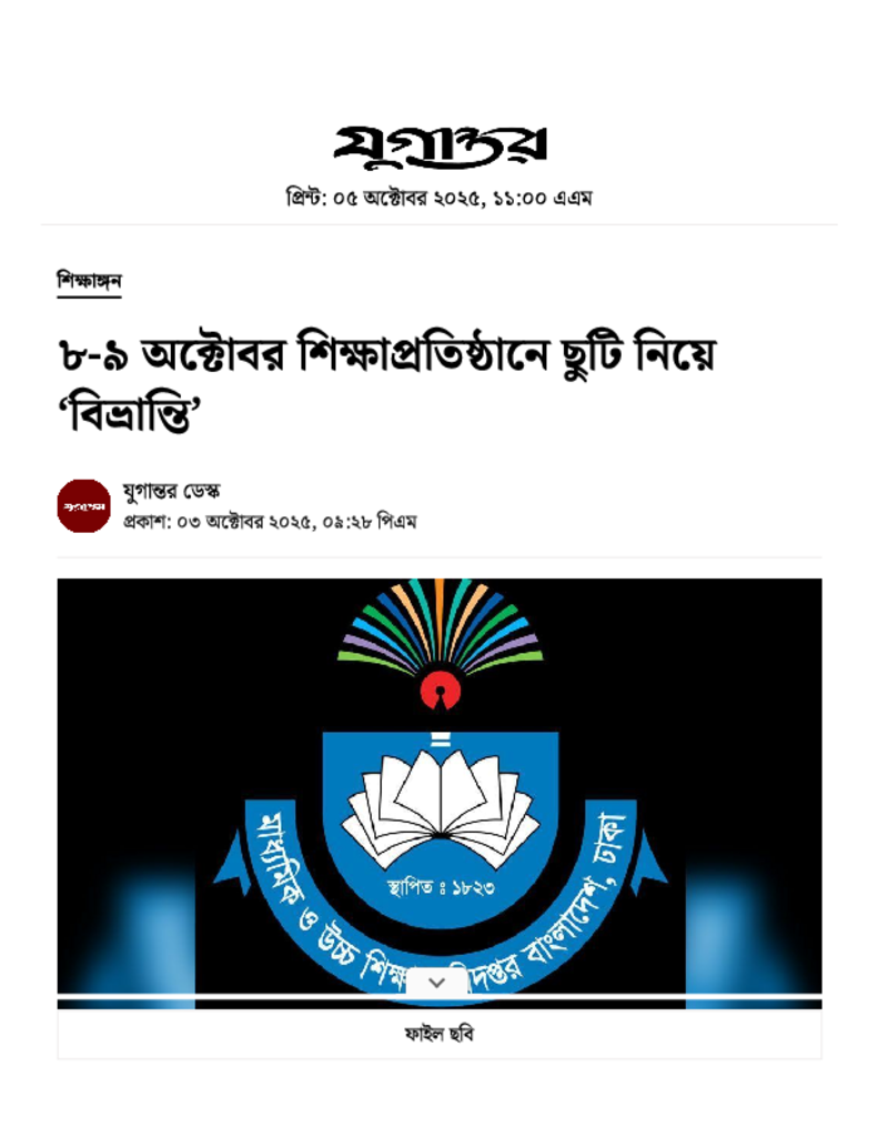 ৮-৯ অক্টোবর শিক্ষাপ্রতিষ্ঠানে ছুটি নিয়ে ‘বিভ্রান্তি’.pdf Published on 03 October 2025 Newspaper দৈনিক যুগান্তর Category Educational Ministry / Departments Download