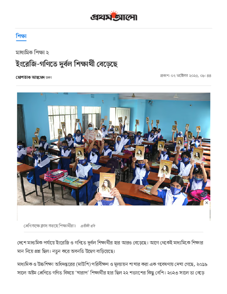 ইংরেজি-গণিতে দুর্বল শিক্ষার্থী বেড়েছে.pdf Published on 07 October 2025 Newspaper দৈনিক প্রথম আলো Category Personal Opinion / Discussion / Commentary Download