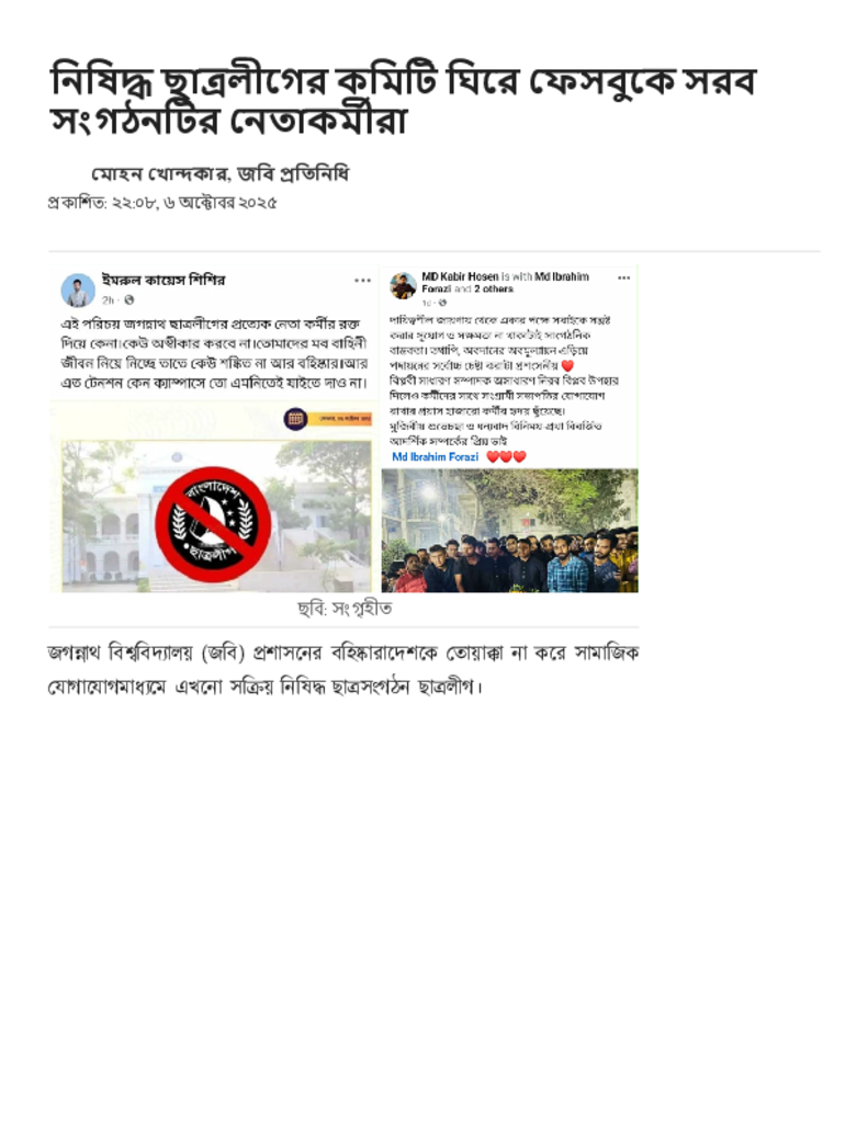 নিষিদ্ধ ছাত্রলীগের কমিটি ঘিরে ফেসবুকে সরব সংগঠনটির নেতাকর্মীরা.pdf Published on 06 October 2025 Newspaper দৈনিক জনকণ্ঠ Category Student Politics Download