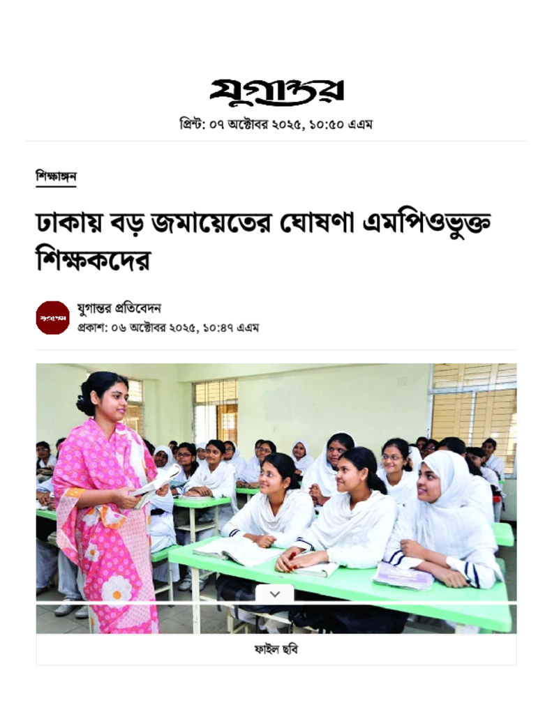 ঢাকায় বড় জমায়েতের ঘোষণা এমপিওভুক্ত শিক্ষকদের.pdf Published on 06 October 2025 Newspaper দৈনিক যুগান্তর Category Others Download