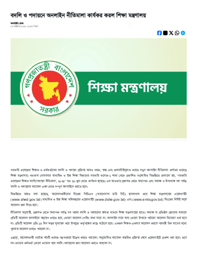 বদলি ও পদায়নে অনলাইন নীতিমালা কার্যকর করল শিক্ষা মন্ত্রণালয়.pdf Published on 07 October 2025 Newspaper দৈনিক আমাদের সময় Category Educational Ministry / Departments Download