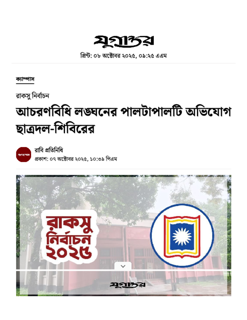 আচরণবিধি লঙ্ঘনের পালটাপালটি অভিযোগ ছাত্রদল-শিবিরের.pdf Published on 07 October 2025 Newspaper দৈনিক যুগান্তর Category Student Politics Download