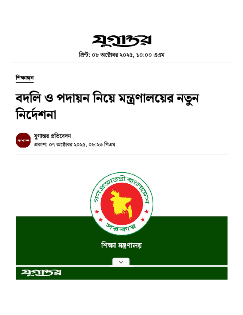 বদলি ও পদায়ন নিয়ে মন্ত্রণালয়ের নতুন নির্দেশনা.pdf Published on 07 October 2025 Newspaper দৈনিক যুগান্তর Category Educational Ministry / Departments Download
