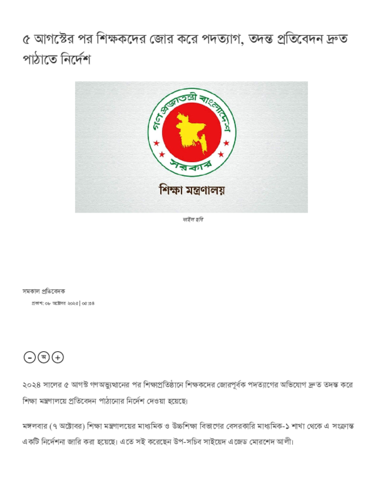 ৫ আগস্টের পর শিক্ষকদের জোর করে পদত্যাগ, তদন্ত প্রতিবেদন দ্রুত পাঠাতে নির্দেশ.pdf Published on 08 October 2025 Newspaper দৈনিক সমকাল Category Educational Ministry / Departments Download