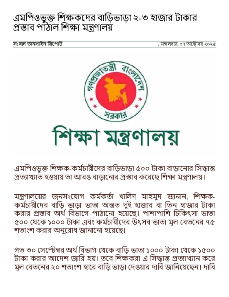 এমপিওভুক্ত শিক্ষকদের বাড়িভাড়া ২-৩ হাজার টাকার প্রস্তাব পাঠাল শিক্ষা মন্ত্রণালয় _ সংবাদ.pdf Published on 07 October 2025 Newspaper দৈনিক সংবাদ Category Educational Ministry / Departments Download