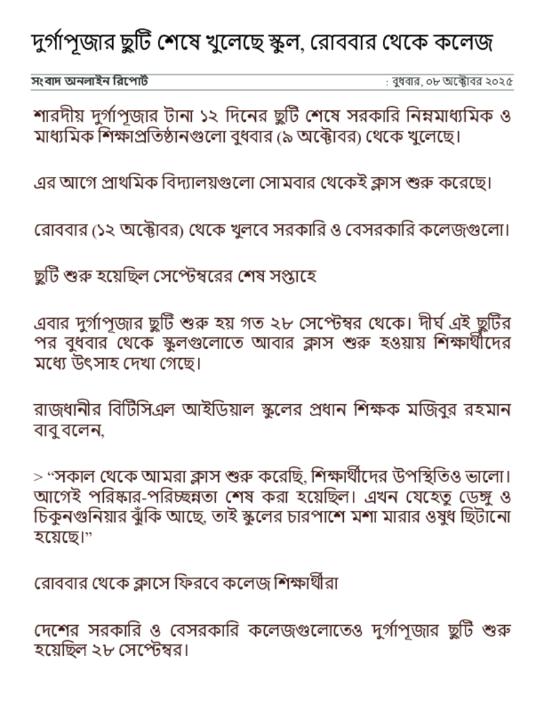 দুর্গাপূজার ছুটি শেষে খুলেছে স্কুল, রোববার থেকে কলেজ _ সংবাদ অনলাইন.pdf Published on 08 October 2025 Newspaper দৈনিক সংবাদ Category General Education Download