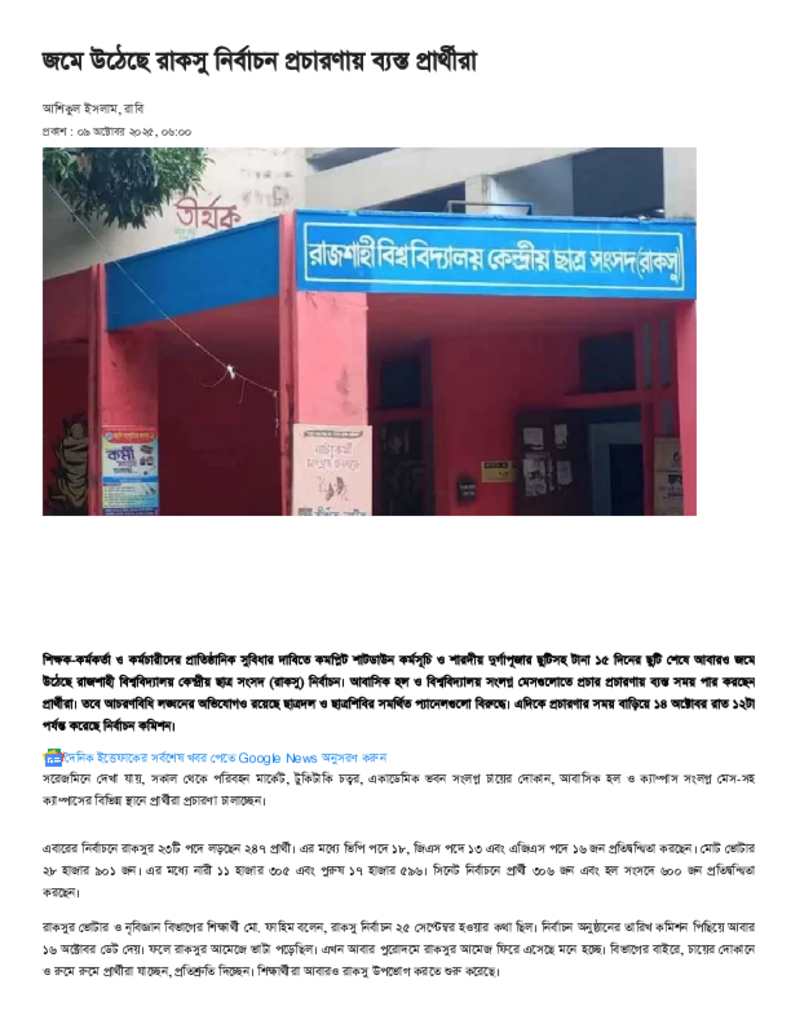 জমে উঠেছে রাকসু নির্বাচন প্রচারণায় ব্যস্ত প্রার্থীরা.pdf Published on 09 October 2025 Newspaper দৈনিক ইত্তেফাক Category Student Politics General Education Download
