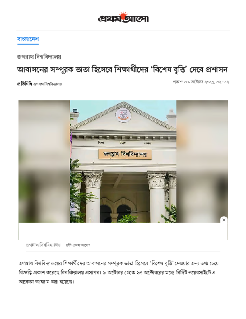 আবাসনের সম্পূরক ভাতা হিসেবে শিক্ষার্থীদের ‘বিশেষ বৃত্তি’ দেবে প্রশাসন.pdf Published on 09 October 2025 Newspaper দৈনিক প্রথম আলো Category Educational Ministry / Departments General Education Download