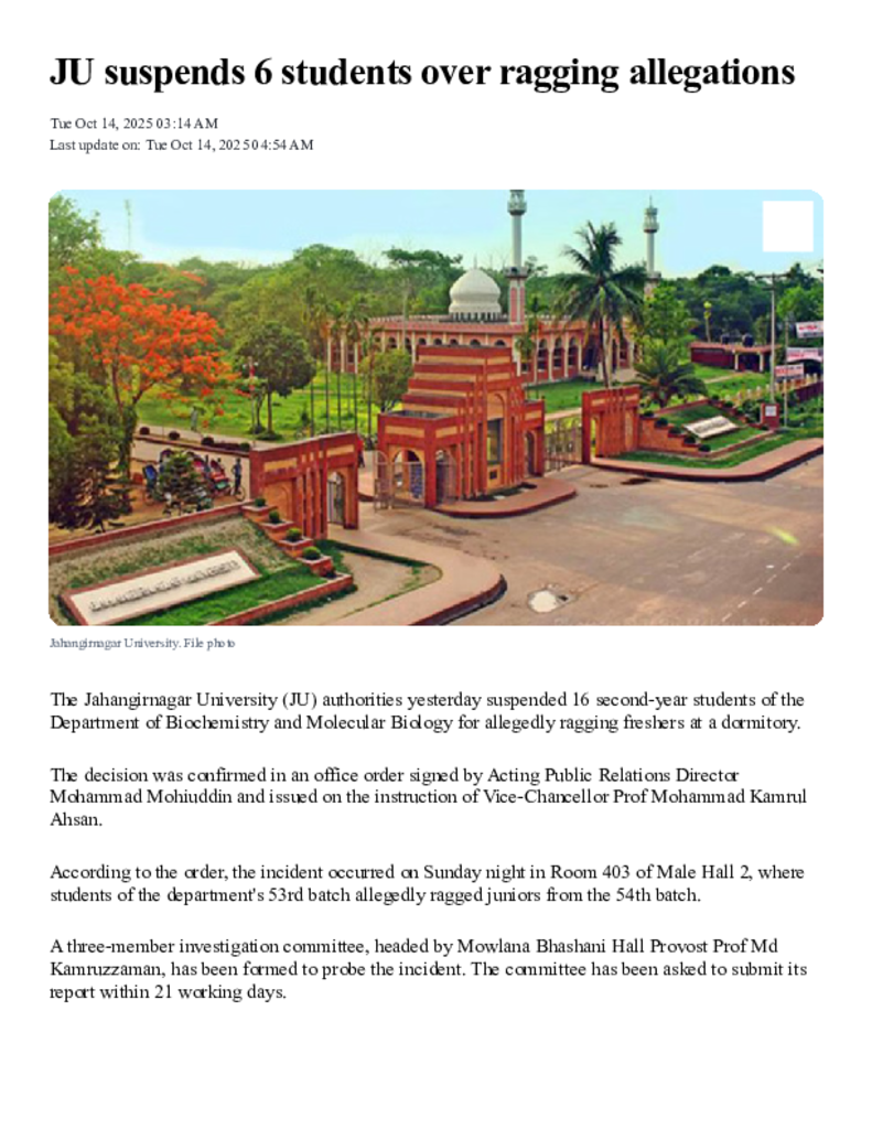 JU suspends 6 students over ragging allegations _ The Daily Star.pdf Published on 14 October 2025 Newspaper The Daily Star Category Others General Education Download