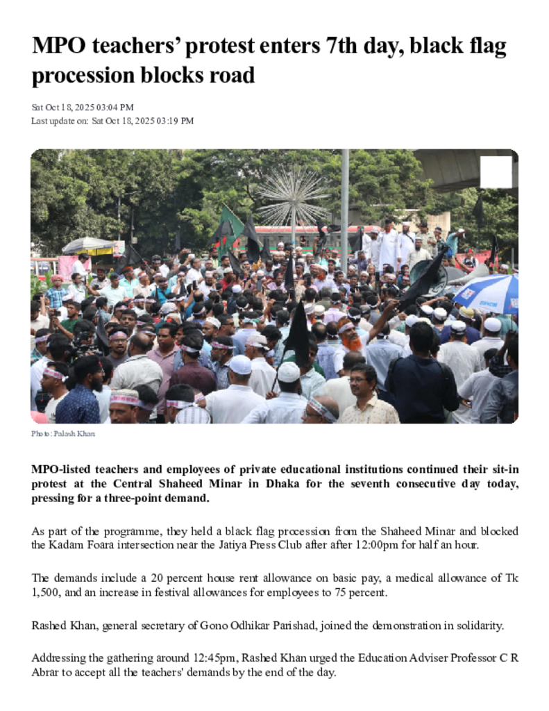 MPO Teachers Protest in Dhaka _ MPO teachers’ protest enters 7th day, black flag procession blocks road.pdf Published on 18 October 2025 Newspaper The Daily Star Category Others Download