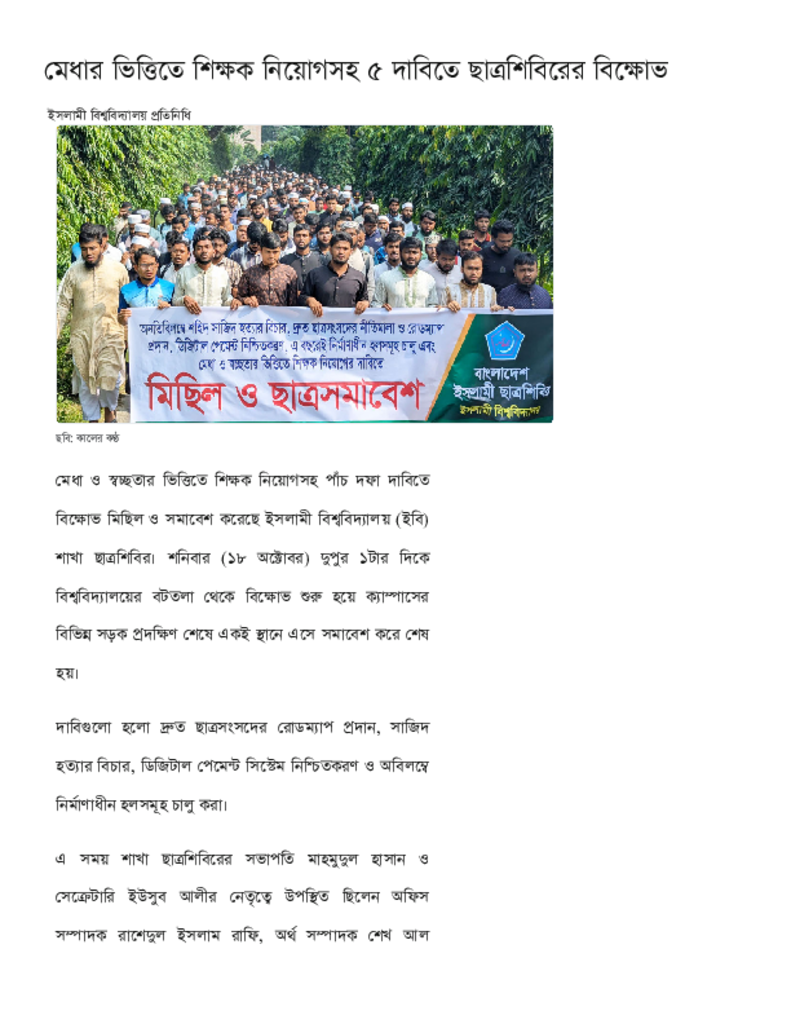 মেধার ভিত্তিতে শিক্ষক নিয়োগসহ ৫ দাবিতে ছাত্রশিবিরের বিক্ষোভ.pdf Published on 18 October 2025 Newspaper দৈনিক কালের কন্ঠ Category Student Politics General Education Download