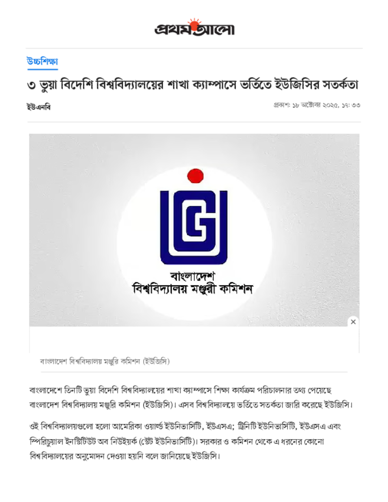 ৩ ভুয়া বিদেশি বিশ্ববিদ্যালয়ের শাখা ক্যাম্পাসে ভর্তিতে ইউজিসির সতর্কতা.pdf Published on 18 October 2025 Newspaper দৈনিক প্রথম আলো Category Educational Ministry / Departments General Education Download
