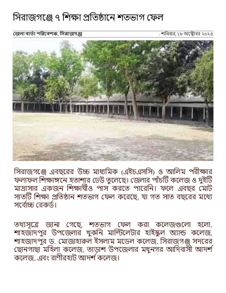 সিরাজগঞ্জে ৭ শিক্ষা প্রতিষ্ঠানে শতভাগ ফেল _ সংবাদ অনলাইন.pdf Published on 18 October 2025 Newspaper দৈনিক সংবাদ Category Public Examination Public Examination HSC Download