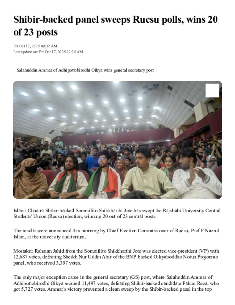 Shibir-backed panel sweeps Rucsu polls, wins 20 of 23 posts _ The Daily Star.pdf Published on 17 October 2025 Newspaper The Daily Star Category Student Politics General Education Download