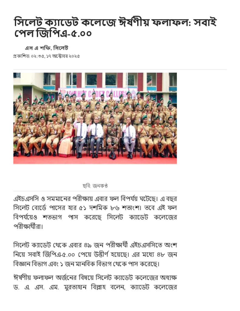 সিলেট ক্যাডেট কলেজে ঈর্ষণীয় ফলাফল_ সবাই পেল জিপিএ-৫.০০.pdf Published on 17 October 2025 Newspaper দৈনিক জনকণ্ঠ Category Public Examination Public Examination HSC Download
