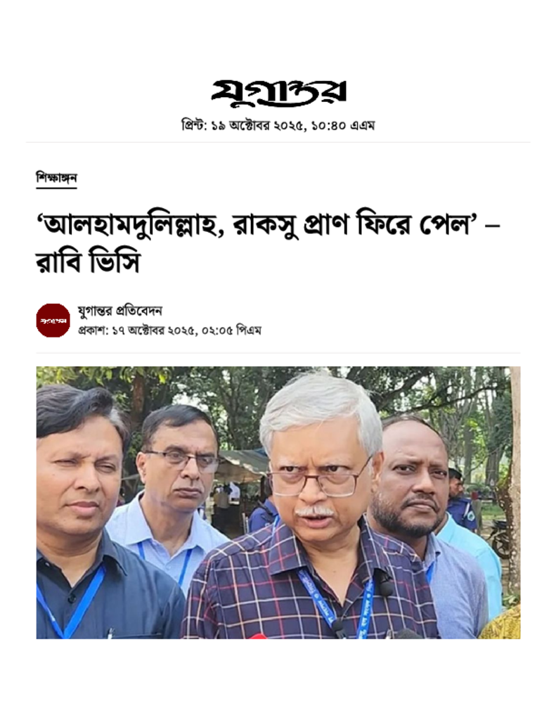 ‘আলহামদুলিল্লাহ, রাকসু প্রাণ ফিরে পেল’ – রাবি ভিসি.pdf Published on 17 October 2025 Newspaper দৈনিক যুগান্তর Category Personal Opinion / Discussion / Commentary General Education Higher Education Public Download